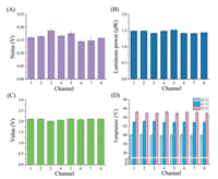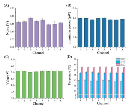 Figs. 3A-D depict the evaluation of the uniformity of the system from four important aspects (background, luminous power, values of eight PCR tubes filled with pure water, and temperature). The following results were obtained: (Ⅰ) The measured noises of the eight channels represent the background uniformity, and the CVV was an average of 3.24% (Fig. 3A). (Ⅱ) The optical power of the eight channels denotes the luminous power uniformity, and the CVV was an average of 0.7% (Fig. 3B). (Ⅲ) The voltage signals of the eight channels filled with 25 µL of pure water signify the absorbance uniformity, and the CVV was 0.43% in average (Fig. 3C). (Ⅳ) The temperatures of the eight channels at 60 ℃, 63 ℃, and 65 ℃ indicate the temperature uniformity, and the average CVVs were 0.48%, 0.43%, and 0.38%, respectively (Fig. 3D). The CVVs of every eight channels were less than 5% in the uniform testing experiments (Table S2 in Supporting information). The above results demonstrated that the established system has very good uniformity.