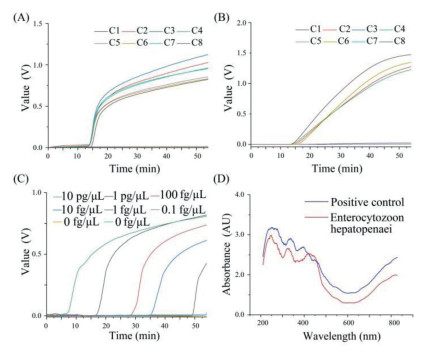 We designed three groups of experiments to verify the EHP detection capability of the device. (Ⅰ) Eight samples (seven are positive and one is negative) were used to verify the effectiveness of the device. (Ⅱ) Four positive and four negative samples were used to verify the device effectiveness and the existence of cross-contamination. (Ⅲ) Eight samples (six are positive samples diluted from 10 pg/µL to 10−4 pg/µL and two are negative samples) were used to verify the sensitivity of the device. The curves of the results were shown in Fig. 4. Seven curves were takeoff and have similar trends, imply that the device has good uniformity and stability (Fig. 4A); Four positive were takeoff, and others were not, that indicated there was no cross-contamination (Fig. 4B); As the concentration of positive samples decreased, the take-off time of the curve was also delayed, and the lowest detection limitation was 0.1 fg/µL (Fig. 4C). Besides, all positive samples can be correctly judged by the designed algorithm.