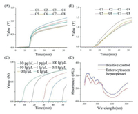 | Fig. 4. (A) Seven positive and one negative samples. (B) Four positive and four negative samples. (C) Sensitivity test by different concentrations of samples. (D) Absorbance test by ultraviolet-visible near infrared spectrum. | |