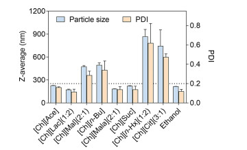 | Fig. 1. Effect of Ch-ILs on particle size and PDI of PTX nanocrystals utilizing Ch-ILs and ethanol. | |