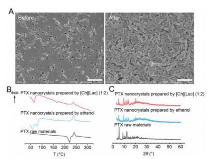 | Fig. 2. Characterization of PTX nanocrystals. (A) Morphology before filtration and after resuspension. (B) Differential scanning calorimetry (DSC) patterns of PTX nanocrystals prepared from either [Ch][Lac] (1:2) or ethanol, and PTX raw materials. (C) Powder X-Ray diffraction (PXRD) patterns of PTX nanocrystals that are prepared from either [Ch][Lac] (1:2) or ethanol, and PTX raw materials. Scale bar: 1 μm. | |
