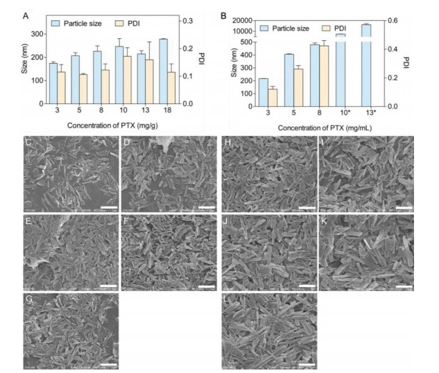 We tried to prepare nanocrystals at higher PTX concentration. The solubility of PTX in [Ch][Lac] (1:2) was measured to be 9.74 ± 0.64 mg/g at 25 ℃ and 18.13 ± 0.15 mg/g at 50 ℃, respectively. Therefore, [Ch][Lac] (1:2) was heated to 50 ℃ to get PTX concentration larger than 10 mg/g, while 18 mg/g was set as the maximum concentration. Both the particle size and PDI of PTX nanocrystals slightly increased at higher PTX concentration in [Ch][Lac] (1:2), which were all below 300 nm and 0.20, respectively (Fig. 3A). Even when the concentration of PTX was close to the saturation solubility in [Ch][Lac] (1:2), uniform nanocrystals with size of 278.5 ± 1.504 nm can be prepared. SEM photographs (Figs. 3C-G) confirmed the results. On the contrary, when ethanol was adopted as the solvent, sharp increase on size and PDI of products was observed at higher PTX concentration (Figs. 3B and H-L). When PTX concentration exceeded 8 mg/mL in ethanol, the size of nanocrystals reached 479.0 ± 14.63 nm with PDI value as high as 0.424 ± 0.037. Further increase in concentration even led to PTX crystals of micrometers. Similar results were obtained when ethanol was adopted as the solvent in other bottom-up processes [27, 28].