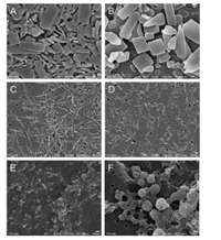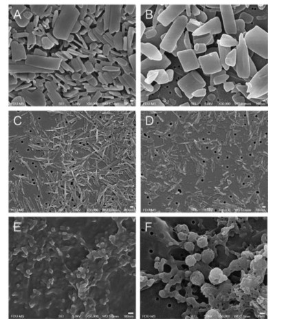 | Fig. 4. Morphologies of simvastatin nanosuspensions prepared from (A) methanol and (B) [Ch][Ace], quercetin nanosuspensions prepared from (C) ethanol and (D) [Ch][Ace], ursodeoxycholic acid nanosuspensions prepared through (E) alkali-acid neutralization and from (F) [Ch][Ace]. Scale bar: 100 nm. | |