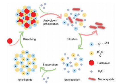 Scheme 1 shows the process. Drugs are firstly dissolved in ILs. Upon introduction of water, the anti-solvent, into the solution, ILs lose the solubilizing capability due to ionic dissociation and lead to precipitation of the drug. The resulted nanocrystals are collected by filtration. The ILs are recovered by evaporating water from the ionic solution.
