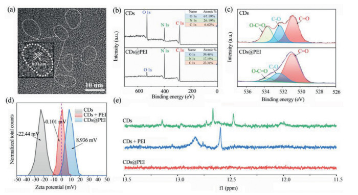 | Fig. 1. Material characterization. (a) High-resolution TEM image of CDs@PEI, the white dotted lines show the profiles of each CDs; (b) XPS analysis of CDs and CDs@PEI; (c) High-resolution O 1s XPS spectra of CDs and CDs@PEI; (d) Zeta potential spectra of CDs, CDs@PEI and CDs + PEI in aquesou solutions; (e) 1H NMR spectra of CDs, CDs@PEI and CDs + PEI in DMSO‑d6 with the same CDs concentration. | |