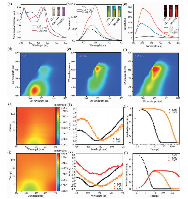 | Fig. 2. Optical properties analysis. (a) UV–vis absorption spectra of CDs, CDs + PEI and CDs@PEI aqueous solutions (inset: photographs of CDs, CDs + PEI and CDs@PEI aqueous solutions under daylight); PL spectra of CDs, CDs@PEI and CDs + PEI dilute aqueous solutions under excitation at 450 nm (b) and 550 nm (c), respectively. The insets show the fluorescence images of CDs, CDs + PEI and CDs@PEI aqueous solutions under 450 nm and 550 nm excitation; Excitation (EX)-emission (EM) mapping images of CDs (d), CDs + PEI (e) and CDs@PEI (f) dilute aqueous solutions; 3D mapping images of (g) CDs and (j) CDs@PEI in aqueous solutions; Deconvoluted species associated TA spectra of (h) CDs and (k) CDs@PEI in aqueous solutions; Population dynamics of (i) CDs and (l) CDs@PEI in aqueous solutions. | |