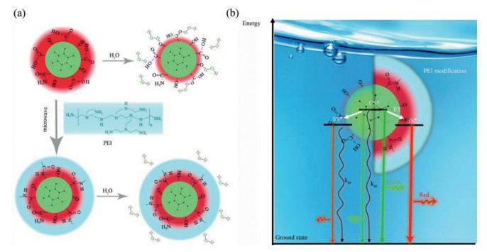 A possible luminescence mechanism for CDs and CDs@PEI in aqueous solutions was illustrated in Scheme 1. In aqueous environment, strong interactions of pure CDs with water molecules significantly quench the fluorescence from the core state and surface state. After microwave heating induce PEI modification, the surface of CDs was functionalized by PEI molecules, which effectively prevent the interactions of CDs with water molecules, leading to strengthened energy transfer from core state to surface state and enhanced red emission in aqueous solution.