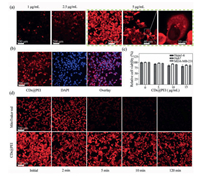 | Fig. 3. Fluorescence confocal microscope images of stained Hepa1–6 cells upon laser irradiation (543 nm). (a) Fluorescence images of Hepa1–6 cells incubated with various concentrations of CDs@PEI (1, 2.5, 5 µg/mL) for 1.5 h; (b) Colocalization of CDs@PEI (5 µg/mL) with DAPI on Hepa1–6 cells. (c) MTT assay of Hepa1–6, Huh7, MDA-MB-231 cells relative viability after 12 h with different concentrations of CDs@PEI. (d) Fluorescent stability of CDs@PEI (5 µg/mL) and Mito Tracker red comparison for 2, 5, 10 and 120 min continuous laser irradiation (532 nm). | |