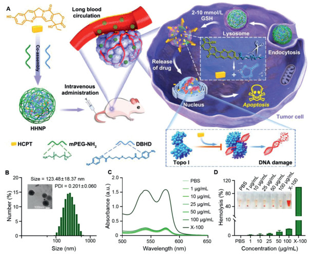 | Fig. 1. (A) Synthesis of reductive-responsive chemotherapeutic nanogels and application in enhanced chemotherapy. (B) DLS size distribution histogram and TEM image of HHNP. (C) UV absorption spectra and (D) Hemolysis rate of different concentrations of HHNP, PBS, 0.1% Triton X-100 and blood cells after incubation. Data are presented as mean ± SD (n = 3). | |