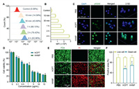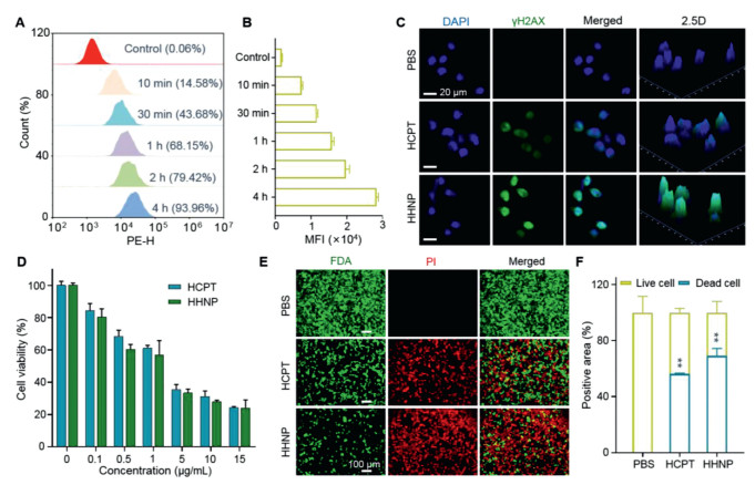 | Fig. 2. Cellular uptake and cytotoxicity assays of HHNP in 4T1 cells. (A) Uptake of HHNP at different time points in the 4T1 cell with flow cytometry analysis and (B) quantification of cellular uptake in 4T1 cells. (C) Fluorescence imaging of DNA damage. (D) Cell viability of incubating with HCPT and HHNP for 72 h. (E) Distribution and (F) quantitative analysis of live and dead 4T1 cells after 24 h incubation with, free HCPT and HHNP. Data are presented as mean ± SD (n = 3). P < 0.05; **P < 0.01. | |