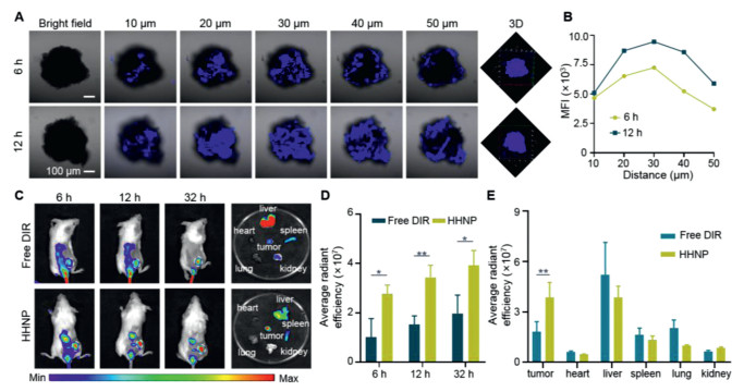 | Fig. 3. Penetration imaging (A) and (B) fluorescence quantification of HHNP in the 4T1 tumor spheres for 6 and 12 h, respectively. (C) In-vivo fluorescence imaging and (D) average radiant fluorescence intensity of distribution in 4T1 mice model at 6, 12 and 32 h, respectively. (E) The fluorescence intensity of the tumor and five internal organs (heart, liver, spleen, lung, kidney) after injection of free DIR and HHNP. Data are presented as mean ± SD (n = 3). P < 0.05; **P < 0.01. | |