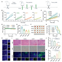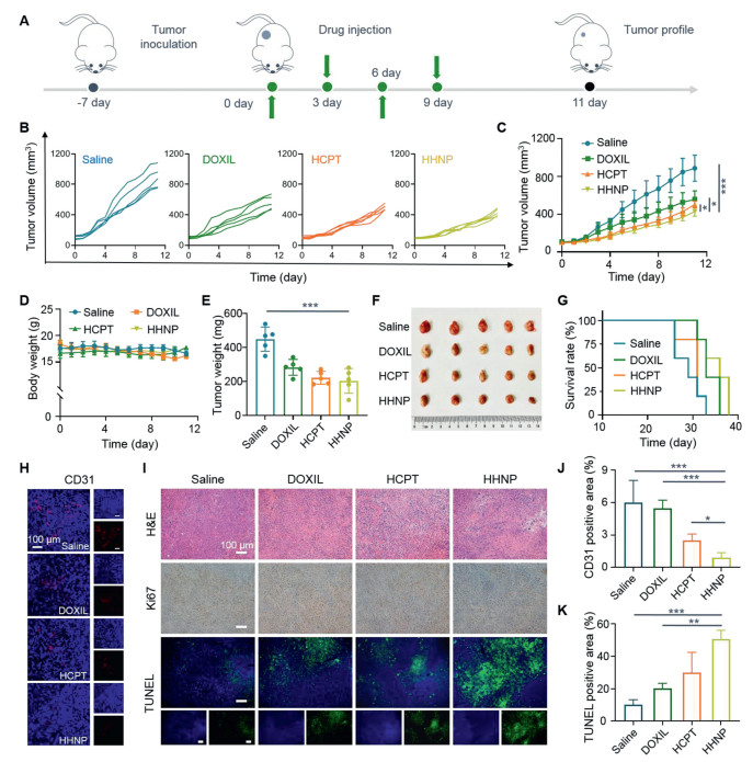 | Fig. 4. In vivo treatment of HHNP on 4T1 tumor-bearing mice. (A) Course of treatment in 4T1 tumor-bearing mice. (B) Tumor volume changes during 11 days of treatment in various groups. (C) Average tumor volume changes. (D) Average body weight changes. (E) Tumor quality in various drug groups after treatment. (F) Digital images and (G) survival curve of the various drug groups (n = 5). (H) Quantification the fluorescence changes in CD31 slice images and (I) H & E, Ki67 and TUNEL slice images. (J) Quantification of CD31 and (K) TUNEL in tumor tissue sections from mice after treatments. Data are presented as mean ± SD (n = 3). P < 0.05; **P < 0.01; *** P < 0.001. | |