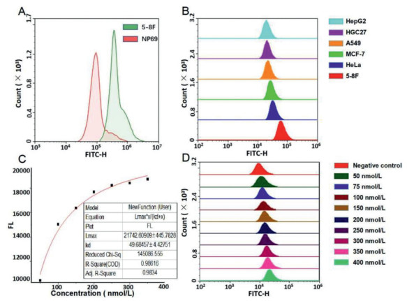 | Fig. 3. (A) Incubating the fluorescent aptamer with two types of cells, respectively, and measure the mean fluorescence intensity. (B) Incubating the fluorescent aptamer with six types of tumor cells, respectively, and measure the mean fluorescence intensity. (C) Curve fitting results. (D) Incubating the 5-8F cells with 10 different groups in various concentration of fluorescent aptamer, measure the mean fluorescence intensity. Color controls shows in right side legend. | |