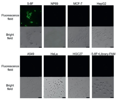 Finally, to get intuitive evidence for the specific recognition of our obtained nucleic acid aptamer, we used confocal microscopy to image 5-8F cells, NP69 cells, HepG2 cells, A549 cells, HGC-27 cells, HeLa cells and MCF-7 cells incubated with fluorescence-modified aptamers for observation. To confirm that 5-8F cells can only bind specifically to our obtained nucleic acid aptamer rather than to the initial libraries, we also designed an experimental group of 5-8F cells incubated with fluorescence-modified libraries. As can be seen from Fig. 4, only 5-8F cells incubated with aptamer among all the experimental groups showed obvious fluorescence, demonstrating the specificity and sensitivity of our aptamer in recognition of 5-8F cells.