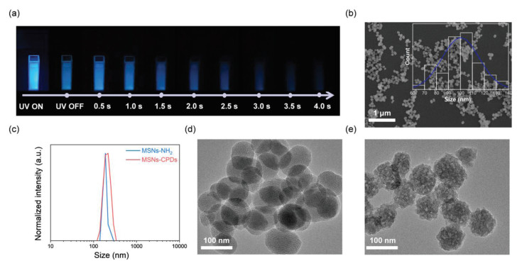 | Fig. 1. (a) Photographs of MSNs-CPDs (10 mg/mL in water) at different delay time after UV irradiation. (b) SEM image of MSNs-CPDs (inset: particle size distribution). (c) Hydrodynamic diameter distributions of MSNs-NH2 and MSNs-CPDs. (d) TEM image of MSNs-NH2. (e) TEM image of MSN—CPDs. | |