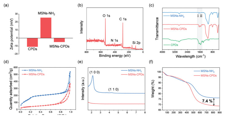 | Fig. 2. (a) Zeta potentials of CPDs, MSNs-NH2 and MSNs-CPDs. (b) XPS spectrum of MSNs-CPDs. (c) FT-IR spectra of MSNs-NH2, MSNs-CPDs and CPDs. (d) N2 adsorption-desorption isotherms. (e) Powder small-angle XRD patterns. (f) TGA curves of MSNs-NH2 and MSNs-CPDs. | |
