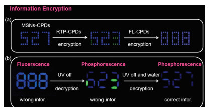 | Fig. 4. (a) The schematic diagrams of information encryption. (b) Water-related multistage information encryption application of MSNs-CPDs. | |
