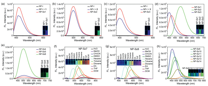 | Fig. 1. Fluorescence emission spectra and fluorescent images of NP-I and the in situ fluorescence enhancement after reaction with 1 (a), 2 (b), and 3 (c) in CH3CN. (d, e) Fluorescence emission spectra and fluorescent images of NP-Sz1–6 in CH3CN. Fluorescence emission spectra and fluorescent images of NP-Sz7 (f) and NP-Sz8 (g) in different solvents. (h) Fluorescence emission spectra and fluorescent images of NP-Sz9–14 in CH3CN. | |