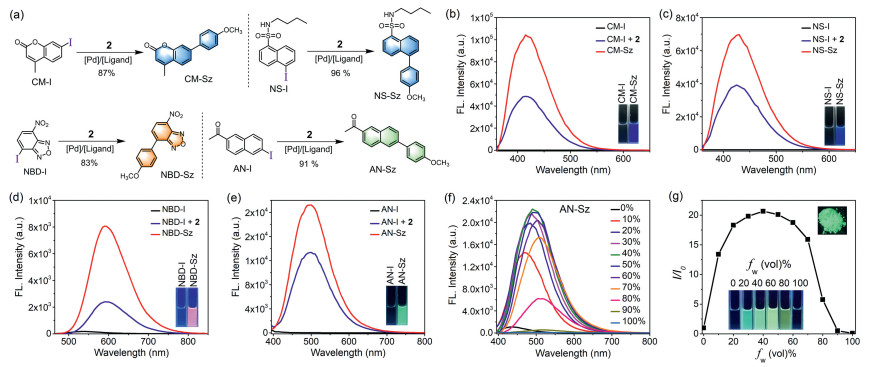 | Fig. 2. (a) Suzuki-Miyaura reaction between CM-I/NS-I/NBD-I/AN-I and boronic acid 2. (b-e) Fluorescence emission spectra and fluorescent images of 10 µmol/L CM/NS/NBD/AN probes in acetonitrile. (f) Fluorescence emission spectra of AN-Sz in CH3CN/H2O mixed solution (10 µmol/L) with different water fractions. (g) Plot of relative emission intensity (I/I0) of AN-Sz vs. water fractions, and its fluorescent image in solid state. | |