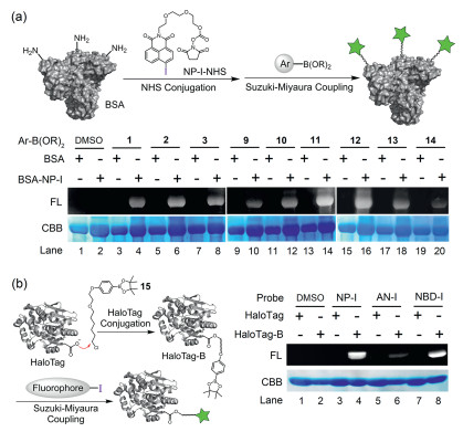 | Fig. 3. (a) Protein labeling of BSA-NP-I conjugate with boron reagents. (b) Protein labeling of HaloTag-B conjugate with aryl iodides. | |