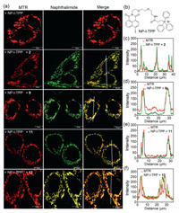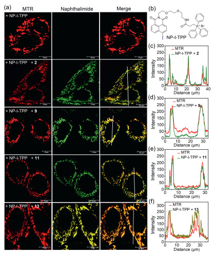 | Fig. 4. (a) Confocal images of Hela cells labeled by Suzuki-Miyaura reaction between NP-I-TPP and 2/9/11/13. (b) Structure of NP-I-TPP. (c-f) Fluorescence line intensity to measure the signal overlap of MTR (red) with naphthalimide (green or yellow). Scale bar = 10 µm. | |