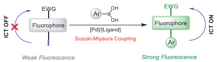 Suzuki-Miyaura cross-coupling, known as the indispensably method for formation of C—C bond in modern organic synthesis, has recently emerged as an attractive bioorthogonal reaction [21]. In pioneering work, the Davis group has developed an efficient Palladium-mediated Suzuki-Miyaura cross-coupling catalytic system for protein conjugation and cell-surface labeling [22-24]. The boronic acid and halogen atom (bromine or iodine) could be treated as the smallest bioorthogonal pair, which has minimal interference in the molecular interactions. On the other hand, as the electron-withdrawing group, halo group is the perfect fluorescence quencher for intramolecular charge-transfer (ICT)-based fluorophore, which usually have donor-π-acceptor (D-π-A) system [25]. We envisioned that replacement of the electron donor with halo group could convert the D-π-A system ("push-pull") to A-π-A system ("pull-pull"), thus block the ICT process, resulting in fluorescence quenching. After Suzuki-Miyaura coupling reaction, new C—C bond was formed and electron-donating aromatic ring was conjugated to the fluorophore as the electron donor, which rebuilt the "push-pull" system and restore the ICT process, producing enhanced fluorescence (Scheme 1). In this contribution, we designed and synthesized five iodo-modified ICT-based fluorophores with different scaffolds. Their fluorescence could be triggered by Suzuki-Miyaura reaction with aryl boronic acid or boronate, giving rise to the in situ assembly of light-up fluorophores. This strategy has been successfully applied for fluorogenic labeling of boronic acid/iodo-modified peptide and protein. More importantly, these probes were found to be highly specific and selective for visualizing subcellular organelle such as mitochondria in live cells under no-wash condition.