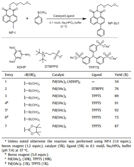 We initially aimed at 1, 8-naphthalimide, the most common ICT fluorophore which has immense potential in the area of optical devices, fluorescent sensors, and bioimaging agents [26]. The most active halo group in the Suzuki-Miyaura reaction, iodo, was installed on 4-position of 1, 8-naphthalimide (NP-I, Table 1) via Sandmeyer reaction (Supporting information). To our satisfaction, the weak visual fluorescence (Figs. 1a-c) and low fluorescence quantum yield (ΦF = 0.006) verified that the iodo group acts as a good quencher for naphthalimide fluorophore. Then Suzuki-Miyaura coupling was performed between NP-I and phenylboronic acid (1) in 0.1 mol/L Na2HPO4 buffer (pH 7.4) at 37 ℃ in the presence of Pd(OAc)2(ADHP)2, a catalytic system developed by the Davis group [22]. To our delight, fluorescent 4-phenyl-1, 8-naphthalimide (NP-Sz1) was obtained in 34% yield (Table 1, entry 1). Addition of phosphine ligand such as 3-(di-tert-butylphosphonium)propane sulfonate (DTBPPS) or sodium 3, 3′, 3′′-phosphinetriyltribenzenesulfonate (TPPTS) could significantly improve the reaction efficiency. We found that Pd(OAc)2 (5%)/TPPTS (5%) system was preferable to catalyze the reaction in high yield (89%) (Table 1, entry 3). The second-order rate constant (k2) under this condition was calculated to be 1.5 L mol−1 s − 1 (Fig. S1 in Supporting information), which is comparable with those of other bioorthogonal reactions [27]. Increasing the amounts of boron reagent or Pd(OAc)2/TPPTS could not significantly improve the yield, while reducing the catalyst loadings decreases the yield obviously (Table 1, entries 4–6). Moreover, similar reaction yield (87%) was observed for the reaction between NP-I and phenylboronic acid pinacol ester (Table 1, entry 7), confirming the same reaction activity between boronic acid and boronate.