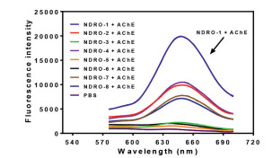 The fluorophore NDRH and probes NDRO-1~8 were synthesized followed the synthetic route in Scheme 1, and the details were described in Supporting information. NDRH displayed a near-infrared (NIR) fluorescence emission with maximum emission at 650 nm and the relationship between fluorescence intensity at 650 nm and the activity of NDRO-1~8 toward AChE was shown in Fig. 1. Among the fluorescent substrates NDRO-1~8, NDRO-1 with acetyl group as the recognition site showed the highest reactivity toward AChE, NDRO-2 containing butyryl group, NDRO-4 containing cyclo-butyryl group, NDRO-7 with bulky furyl methyl ester group and NDRO-8 with bromo substituted butyl ester group displayed moderate activity, NDRO-3 with isobutyl ester group, NDRO-6 with cyclohexyl methyl ester group and NDRO-5 with phenyl methyl ester group barely respond to AChE. From these results, it was speculated that the higher reactivity of NDRO-1, NDRO-2, and NDRO-3 was due to the fact that their acyl groups were alkyl chains with smaller spatial structure, which may be suited to the catalytic cavity of AChE, while NDRO-5 and NDRO-6 were basically not hydrolyzed by the enzyme due to their larger spatial structure. However, from the point of view of reactivity, the reactivity of compound NDRO-1 toward AChE is about twice as high as that of NDRO-2 and NDRO-4, so NDRO-1 was selected as a tool to detect AChE in subsequent experiments Scheme 2. shows the proposed reaction mechanism of NDRO-1 that AChE catalyzes hydrolysis of NDRO-1 and releases fluorophore NDRH.
