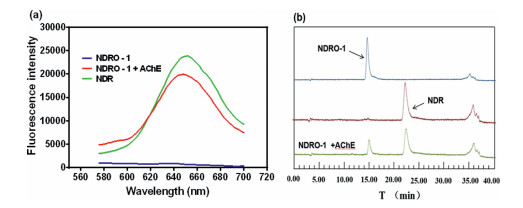 | Fig. 2. (a) Fluorescence spectrum before or after the addition of AChE (λex = 550 nm). (b) High performance liquid chromatogram of NDRO-1, NDR and the reaction mixture (detection wavelength 550 nm). | |