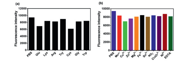 | Fig. 4. (a) Effect of amino acids on the reaction (PBS, Glu, glutamic acid; Lys, lysine; Arg, arginine; Try, tyrosine; Cys, cysteine; Gly, glycine; Trp, tryptophan). (b) Effect of common ions (Mn2+, Cu2+, Zn2+, Mg2+, Fe3+, NO3−, Cr2O72−, Ni2+) and EDTA on the reaction. | |