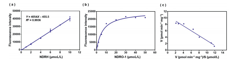 | Fig. 6. (a) The linear curve of the fluorescence intensity with the increasing NDRH concentration (The final concentration is 0–10 µmol/L.). (b) Michaelis-Menten kinetics curves. (c) Eadie-Hofstee curve. | |