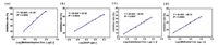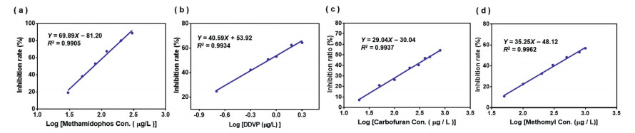 | Fig. 7. (a) Graph of linear relationship between methamidophos concentration logarithm and enzyme inhibition rate. (b) Linear plot of log concentration of dichlorvos and enzyme inhibition rate. (c) The linear relationship between carbofuran concentration logarithm and enzyme inhibition rate. (d) Linear relationship between logarithm of loganide concentration and enzyme inhibition rate. | |