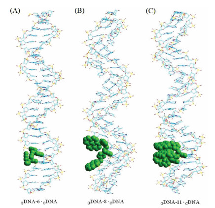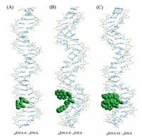 | Fig. 1. Molecular models of (A) duplex 5′-d(TTT T22 GGG TTA GGG TTA GGG TTA GGG) (GDNA-6) · 3′-d(AAA CCC AAT CCC AAT CCC AAT CCC) (CDNA), (B) duplex 5′-d(TTT TT4 GGG TTA GGG TTA GGG TTA GGG) (GDNA-8) · (CDNA) and (C) duplex 5′-d(TTT T44 GGG TTA GGG TTA GGG TTA GGG) (GDNA-11) · (CDNA). The molecular dynamics models were simulated by using energy minimized AMBER calculations. The green balls are diaplayed as the modification sites. | |