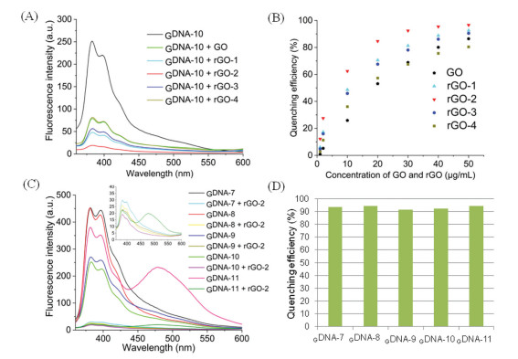 Since the first demonstration of a fluorescent probe based on graphene oxide (GO) complexed with single-stranded DNA (ssDNA) to bind complementary oligonucleotide sequences in 2009 [1], ssDNA/GO complexes, owing to their binding and quenching properties, have been widely applied to detect small molecules, metal ions, and biomolecules as well as for drug-delivery [2-5]. Generally, negatively charged ssDNA is adsorbed on the GO surface by 'π-π' stacking between the DNA nucleobase moieties and GO carbon rings. Reduced graphene oxide (rGO) can be synthesized by the chemical reduction of GO, rGO possesses a high degree of aromaticity, which can facilitate a 'π-π' stacking interface [6-9]. As a result, the different oxygen contents of rGO have various quenching efficiencies for the fluorescence intensity of labeled ssDNA and aptamers, even if the examples are deficient [10, 11].