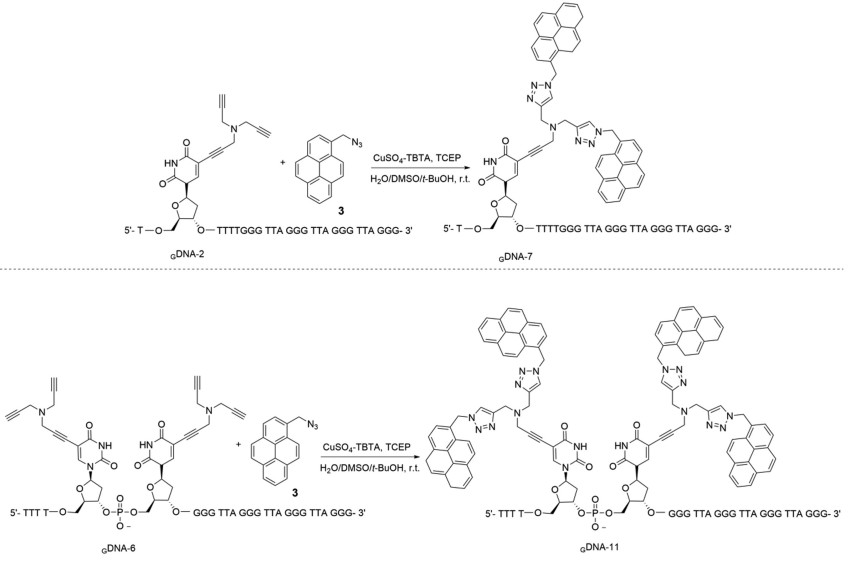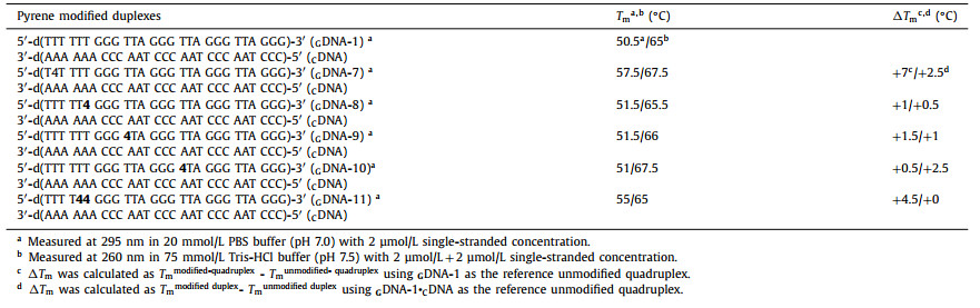 Table 1 Tm values of G-quadruplexes and pyrene oligonucleotide duplexes with mono- or multi-pyrene residues. |