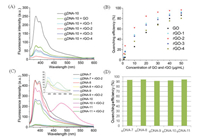 | Fig. 2. (A) Fluorescence spectra of GDNA-10 before and after adding GO or rGO (30 µg/mL) in PBS buffer (20 mmol/L, pH 7.0). (B) Fluorescence quenching efficiency (F0-F)/F0 of GDNA-10 in terms of different concentrations of GO and rGO. F0 and F are the fluorescence intensity before and after the addition of GO or rGO (λex = 340 nm, GDNA-10 concentration = 1 µmol/L). (C) Fluorescence spectra of GDNA before and after adding rGO-2 (30 µg/mL) in PBS buffer (20 mmol/L, pH 7.0). (D) The fluorescence quenching efficiency (F0-F)/F0 at 340 nm of λex and concentration with 1 µmol/L of GDNA. | |