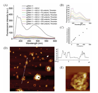 | Fig. 3. (A) Fluorescence spectra of the GDNA-11 and rGO-2 via different concentrations of thrombin in 20 mmol/L of PBS buffer (pH 7.0, λex = 340 nm, GDNA-11 concentration = 1 µmol/L, rGO-2 concentration = 30 µg/L). (B) The amplified fluorescence spectra of the GDNA-11 and rGO-2 after adding thrombin (from 0 to 500 units/mL). (C) Fluorescence intensity spectra of the GDNA-11 and rGO-2 after adding thrombin (from 0 to 500 units/mL, λex = 340 nm, GDNA-11 concentration = 1 µmol/L, rGO-2 concentration = 30 µg/L). (D) AFM images including height profiles of GDNA-11 and rGO-2 senor. (E) The amplified images of GDNA-11 and rGO-2 senor. Scale size: 5 µm × 5 µm. | |