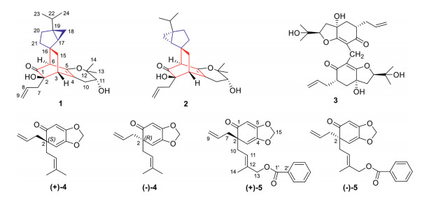 Plants continue to be an extraordinary reservoir of novel molecules of medicinal value, including the discovery of antivirals. Among the 61 antiviral small-molecule drugs approved from 1981 to 2019, 26 of them are synthetic drugs with natural product pharmacophones and 6 of them are derived from natural products [3], including 3 anti-influenza drugs derived from shikimic acid [4, 5], which was first isolated in 1885 from Illicium religiosum [6, 7]. As a rich source for bioactive natural products, a number of antiviral diterpenes [8, 9], sesquiterpenes [10, 11], and prenylated C6nullC3 compounds [12] have been isolated from plants of the Illicium genus. In particular, prenylated C6nullC3 compounds have always been a notable research topic in the field of natural products and synthetic chemistry due to their complex structures, diverse biological activities, and synthetic challenges [13-19]. Equally notable is that natural products in dimerization patterns biosynthetically derived from Diels-Alder cycloaddition have been increasingly attracted the attention of scientists due to their complex skeletons, biological activities, biosynthetic pathways and synthetic challenges [20-26]. We recently reported the isolation and antiviral activities of some structurally diverse prenylated C6—C3 compounds and their complex Diels-Alder adducts with monoterpene or sesquiterpenes from I. oligandrum [19, 27, 28]. Herein, as a part of an investigation into the bioactive compounds from Chinese Illicium plants, the phytochemicals in the ethanol extract of I. oligandrum were explored. Two unprecedented polycyclic spirooliganones C and D (1 and 2) (Fig. 1) were isolated from the roots of I. oligandrum, which features a novel spiro[bicyclo[2.2.2]octane-2, 2′-bicyclo[3.1.0]hexane] carbon skeleton. We also purified and structurally characterized a pair of new enantiomeric prenylated C6—C3 compounds (+)-5 and (−)-5, together with their direct precursors (+)-4 and (−)-4. Moreover, illicidione D (3) and compound 4 were identified by comparing their spectroscopic data with previous literature data [29, 30]. The structural elucidation of the new compounds 1, 2, and 5, the absolute configurations of (+)-4 and (−)-4, and the antiviral activity evaluation of all compounds are described herein.