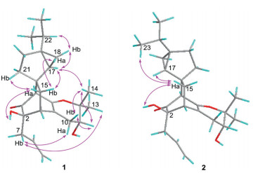 The relative configurations of the seven chiral centers, including one spirocarbon present in the structure of 1, were assigned by employing nuclear Overhauser effect (NOE) and ROESY experiments (Fig. 3). NOEs were observed for Ha-10 and H3-13 after irradiation of Hb-7 (δH 2.27), indicating that the allyl group, Ha-10, and Me-13 were on the same face of the dihydropyranocy-clohexaenone (DHPC) pseudoplane, as depicted in Fig. 2. When Hb-10 was irradiated, strong NOEs for H-11, weak NOEs for 11–hydroxyl protons, and obvious NOEs for Me-14 were observed (Fig. S10 in Supporting information). Similarly, strong NOEs for H-11, weak NOEs for 11–hydroxyl protons, and obvious NOEs for Hb-10 were observed after irradiation with Me-14 (Fig. S10). These data and the ROESY cross peaks of Hb-10/H3-14 suggested that Hb-10 and Me-14 were on the same face of DHPC and the α-orientation for 11–hydroxyl. On the other hand, the stereochemistry of the spirocarbon in the molecule was also unambiguously assigned by NOE experiments. Diagnostic NOEs for 2–hydroxyl protons, H-3, and Hb-21 were observed after irradiation with H-15a (δH 1.98). Moreover, irradiation with H-17 enhanced the signals for Me-14, Hb-15, and Hb-18. These results indicated that the three-member ring in the bicyclo[3.1.0]hexane moiety and Hb-15 were on the same side of the vertical surface formed by C3-C15-C16-C6 and that the three-member ring and CH2-15 were on the same side of the five-membered ring (C16-C17-C19-C20-C21). Furthermore, the observed NOEs for Hb-15, Hb-20, and Hb-21 after irradiation of H-18a and NOEs for H-22 and H-17 after irradiation of H-18b demonstrated that the isopropyl group and H-17 were on another side of the five-membered ring, opposite the three-membered ring and CH2-15, as depicted in Fig. 3.
