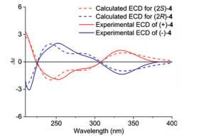 | Fig. 6. Experimental ECD spectra of (+)-4 and (−)-4 and the calculated spectra of (S)-4 and (R)-4. | |