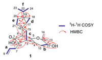 In the 1H NMR spectrum (acetone-d6), one doublet at δH 4.12 (1H, J = 5.5 Hz) and one singlet at δH 3.97, which did not display any correlations in the HSQC spectrum, were assignable to the exchangeable protons of two hydroxyls. The 1H NMR spectrum of 1 also displayed two methyl singlets at δH 1.18 and 1.29 and a singlet at δH 2.50, which correlated with an intense 13C signal at δC 60.6 in the HSQC spectrum. The remaining multiplet signals in the 1H NMR spectrum belonged to six discrete spin systems, a (C7–C9), b (C10–C11), c (C3–C15), d (C17–C18), e (C20–C21), and f (C22–C24) (drawn with thick blue bonds in Fig. 2), as concluded from 1H–1H correlation spectroscopy (COSY) and HSQC analysis.