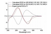 | Fig. 4. Experimental ECD spectrum of 1 (red line) and the calculated spectra of 1 (red dashed line and blue dashed line). | |