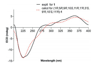 Similar ROESY correlations as those of cycloshizukaol A [18], such as H-1/H-9, H-1′/H-9′, H-2′α/H-3′, indicated that these protons were co-facial and α-oriented. In contrast, the ROESY cross-peaks of H3-14/H-2 and H3-14′/H-2′β revealed that CH3-14 and CH3-14′ were β-configuration. In conclusion, newly ethylated hydroxymethyl branch (C-2) was adopted as β-orientation. To conform the structure and establish the stereochemistry, the single crystals of 1 were obtained in methanol/water (9:1) system and subjected to an X-ray diffraction experiment with Mu Kα radiation [CCDC number: 2019872, Flack parameter: 0.0(2)]. However, the quality of the crystals is insufficient to determine its absolute configurations, but the ethylated hydroxymethyl branch (C-2) from cracked cyclopropane moiety of unit A was very clear. (Fig. S1 in Supporting information). Subsequently, the absolute configuration of 1 was confirmed as 1R, 5R, 9R, 10S, 11R, 1ʹR, 3ʹS, 9ʹR, 10ʹS, 11ʹR by consistent electronic circular dichroism (ECD) curves between experiment and theoretical calculation (Fig. 4) [21]. Hence, the novel structure of 1 was depicted as shown in Fig. 1.