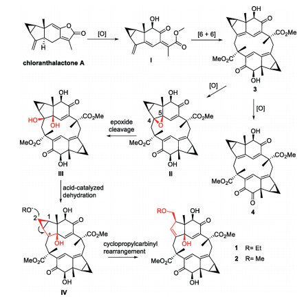 A plausible biogenetic pathway for the formation of cyclopropane cracked sesquiterpenoid dimers 1 and 2 was proposed as shown in Scheme 1. Given the abundant sesquiterpenoid monomer in this genus, chloranthalactone A was considered as the monomeric precursor. First, oxidation of chloranthalactone A initials the biogenetic pathway and affords the intermediates Ⅰ. Subsequently, an intramolecular [6 + 6] cyclization reaction [18, 19] of two molecules Ⅰ produce the 12-membered ring of 3. Alternately, compound 4 might be also derived biogenetically from 3 through oxidation. After the O-cyclization of Δ4, 5 in 3, the epoxide cleavage process occurs thus delivering the intermediate Ⅲ, and Ⅲ then undergoes a facile acid-catalyzed dehydration process leading to the unstable intermediate Ⅳ. Finally, a key cyclopropylcarbinyl rearrangement [22] of Ⅳ gives rise to the sesquiterpenoid dimers 1 and 2.
