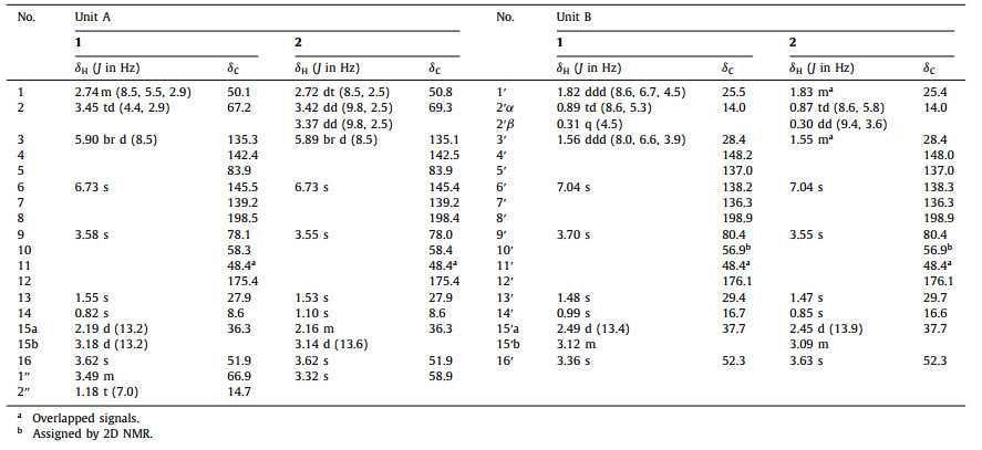 Table 1 1H (600 MHz) and 13C (150 MHz) NMR spectroscopic data for 1 and 2 in CDCl3. |