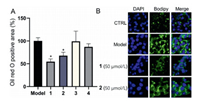 | Fig. 5. Anti-NASH screening of selected isolates in FFA-induced HepG2 cells. (A) Effects on reducing intracellular lipid accumulation of 1, 2, 3, and 4. The control group was treated with a blank medium and the model group was treated with 0.25 mmol/L FFA for 48 h. The other groups were treated with 0.25 mmol/L FFA and selected compounds at a concentration of 50 µmol/L for 48 h. The cells were carried out through oil red O staining, eluted with isopropanol, and measured the relative absorbance (n = 3), compared with the model group (*P < 0.05). (B) FFA-exposed HepG2 cells were treated with compounds 1 and 2 at a concentration of 50 µmol/L for 48 h. Bodipy staining (0.5 µmol/L, 30 min) was used to show the lipid droplets in the cells. | |