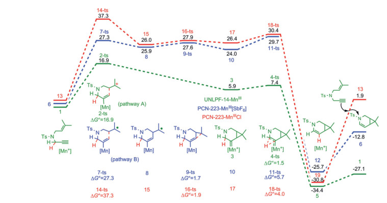 | Fig. 2. Potential energy diagrams (kcal/mol) for [2 + 1] cycloisomerization reactions of enynes catalyzed by UNLPF-14-MnIII, PCN-223-MnIII[SbF6] and PCN-223-MnIIICl as determined at the ONIOM(B3LYP-D3BJ/def2-SVP: UFF) level. | |