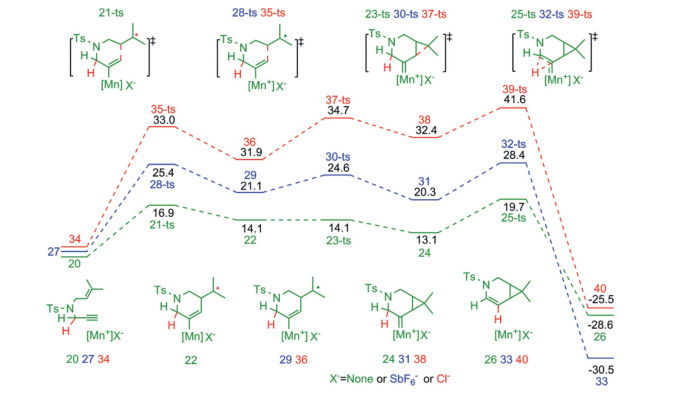 | Fig. 3. Potential energy diagrams (kcal/mol) for the [2 + 1] cycloisomerization of enynes catalyzed by [MnIIIporphyrin]+, [MnIIIporphyrin]+SbF6−, and [MnIIIporphyrin]+Cl−. | |