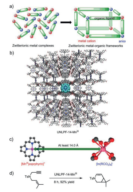 | Scheme 1. (a) Development of zwitterionic metal–organic frameworks from zwitterionic metal complexes; (b) Crystal structure of the cation ([MnIIIporphyrin]+) and anion ([In(CO2)4]−) in completely separated zwitterionic MOF UNLPF-14-MnIII; (c) Shortest distance between [MnIIIporphyrin]+ and [In(CO2)4]− in UNLPF-14-MnIII; (d) [2 + 1] Cycloisomerization of enynes catalyzed by zwitterionic MOF UNLPF-14-MnIII. | |
