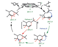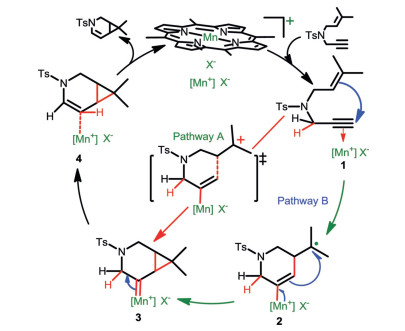 Scheme 2 shows the proposed mechanism, containing two possible pathways, of the MOF-catalyzed [2 + 1] cycloisomerization of 1, 6-enynes, where [MnIIIporphyrin]+X− was considered as the active center. The catalytic cycleis initiated by coordination of the enyne substrate to MnIII, affording intermediate 1 with a metal-activated alkyne. In pathway A, the alkyne moiety is considered to be activated by the cationic metal, facilitating intramolecular nucleophilic attack by the alkene moiety to achieve [2 + 1] cycloaddition through a concerted process, affording [4.1.0]-bicyclic intermediate 3 bearing a Mn–carbene moiety. Alternatively, Mn also exhibited high-spin character, allowing the coordinated alkyne moiety to react with the alkene moiety through a radical-type addition to afford radical intermediate 2. A sequential radical coupling then provides the same intermediate 3. In either pathway, the subsequent 1, 2-hydride shift of complex 3 yields a [4.1.0]-bicyclic enamine product with regeneration of a MnIII species. Pathway A is a much simpler process than pathway B, involving the direct conversion of intermediate 1 to intermediate 3.